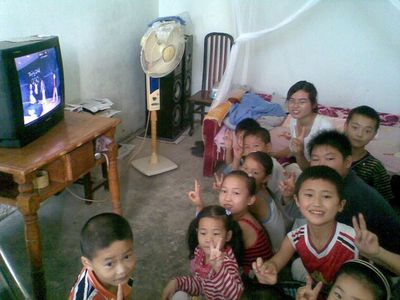 我校06护理学生王超在地震受灾区四川省安县界牌镇,组织当地小朋友观看奥运会比赛,为奥运加油。