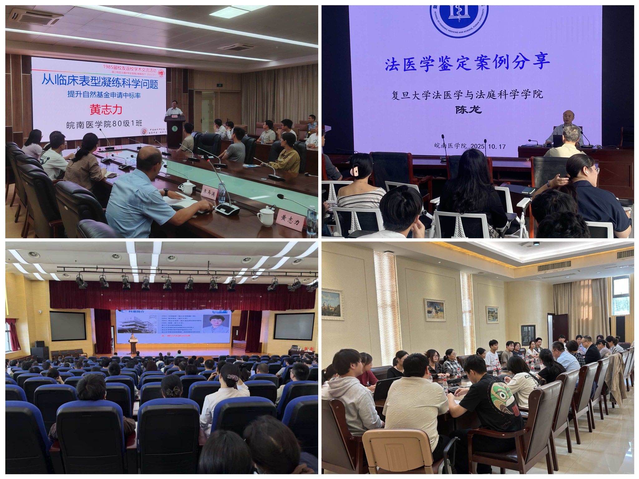 复旦大学黄志力校友以“从临床表型凝练科学问题 提高基金申请中标率——青年学者成长之路”为题,面向学校国自然在研及申报人员分享科研思路与申报技巧,为青年学者科研成长支招。复旦大学陈龙校友聚焦“法医学鉴定案例分享”,通过真实案例解析,为法医学院师生搭建理论与实践的沟通桥梁,助力专业教学与实践能力提升。浙江大学罗本燕校友围绕“医院学科建设”主题,与我校附属医院各科室医护骨干深入研讨,从学科规划、人才培养等维度为医院学科发展建言献策。李幸芳校友则与药学院高层次人才及博士展开座谈,围绕学科前沿动态与科研合作方向交流探讨。