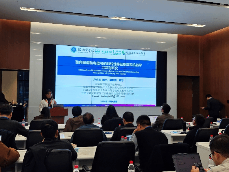 智慧医疗分论坛由安徽省人工智能学会智慧医疗专委会主任委员叶明全教授主持,剑桥大学计算机科学系博士后研究员夏彤博士、中国科学技术大学计算机科学与技术学院特任副研究员程明月博士等8位专家分别围绕智慧医疗的最新研究进展和应用实践作报告交流。其中,黎青青、卢小杰分别作了题为《基于表观遗传多组学的乳腺癌转移预测研究》《面向癫痫脑电信号的非线性特征提取和机器学习识别研究》的学术报告。