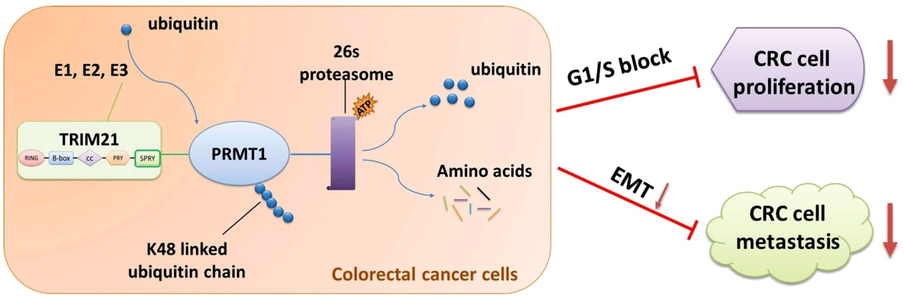 TRIM21调控PRMT1表达抑制结直肠肿瘤发展与转移示意图